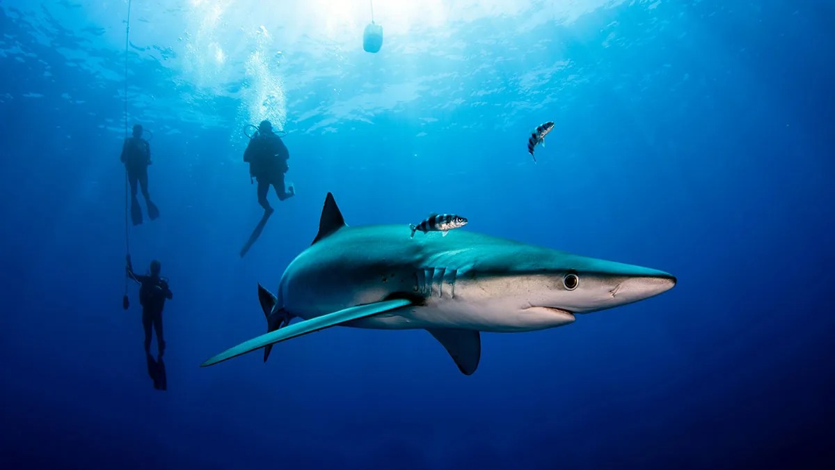 Blue sharks are the most common type of shark seen on the shark cage trip, they are the most social sharks in our waters. We can get up to 10 at a time or more around the cage at times. You may also see Makos and Thresher Sharks. As the water gets warmer we do get the occasional Tiger and or Hammerhead that make a showing.